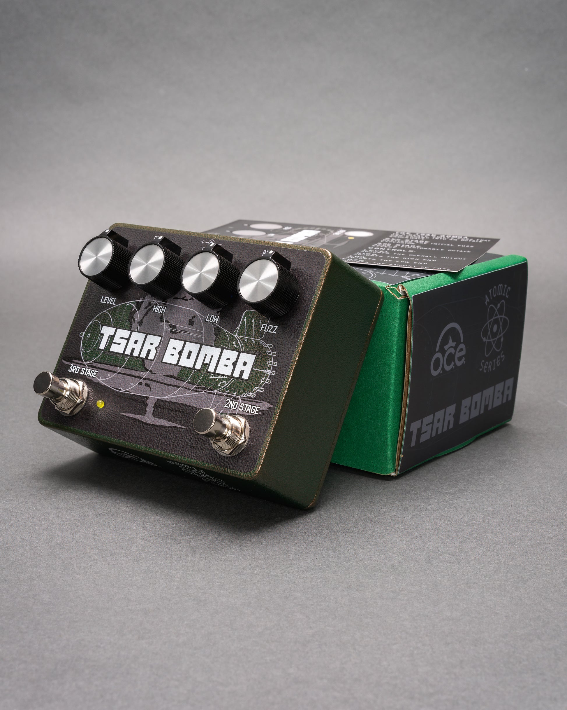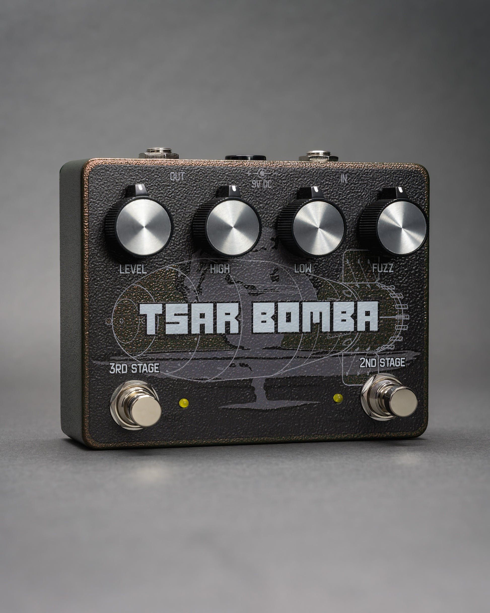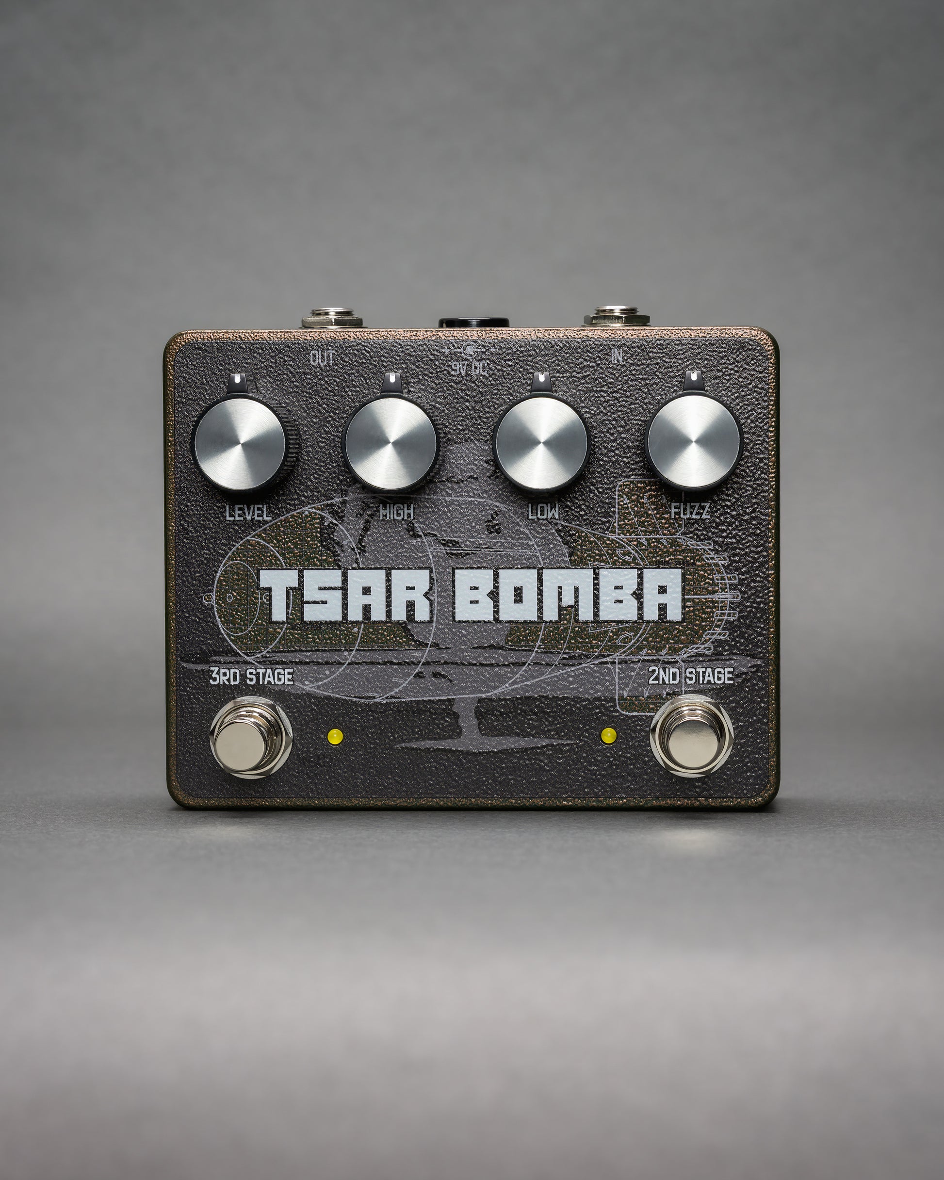 The Tsar Bomba is a heavy, gritty fuzz that can expand into ridiculous octave radiation. Named after the AN602 device, known as Tsar Bomba, a thermonuclear aerial bomb. It was detonated on October 30th, 1961 above an island in the Barents Sea. Its yield was indicated as 50 megatons making it the most powerful nuclear weapon ever created and tested, equivalent to 10 times the combined energy of all conventional bombs dropped in World War II.